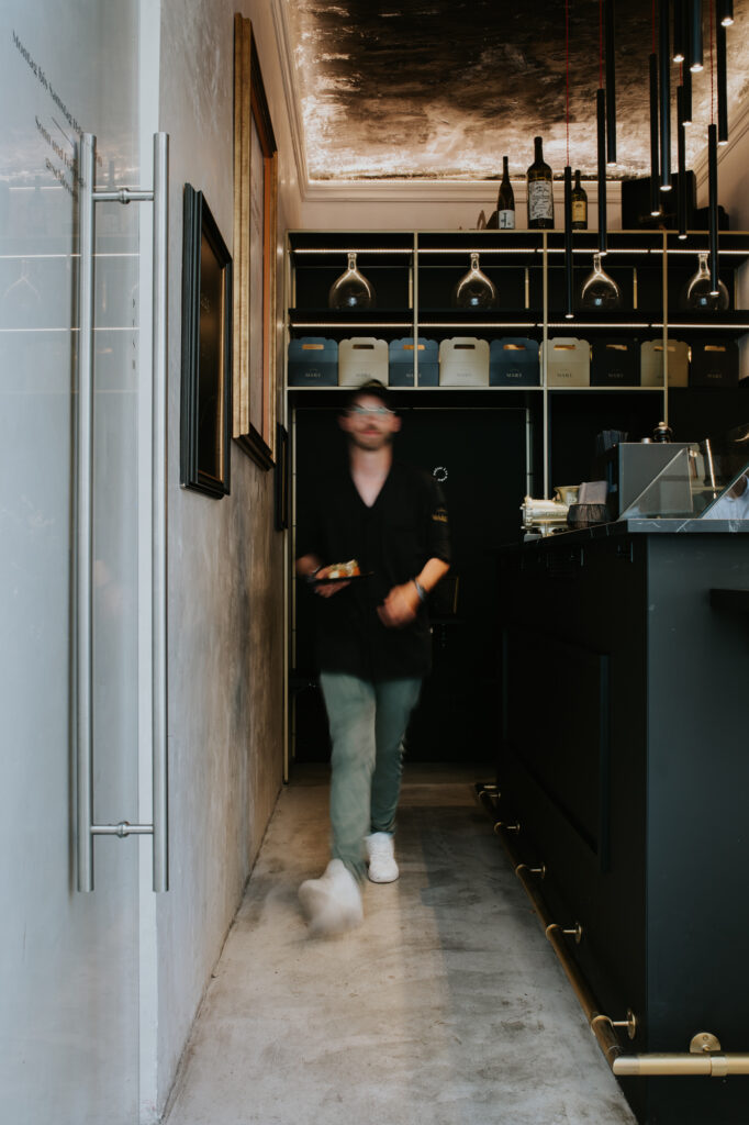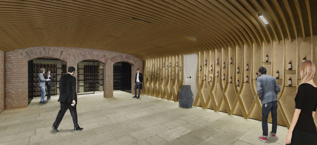 Natürliche Materialien, warme Oberflächen und der historische Charakter des Raums prägen die Atmosphäre. Eine Küchenzeile, ein feines Sounderlebnis, ein prominent platzierter Trinkbrunnen, Weinreben aus Holz und ein klimatisierter Bereich mit Platz für bis zu 1.600 Flaschen machen die Location komplett.